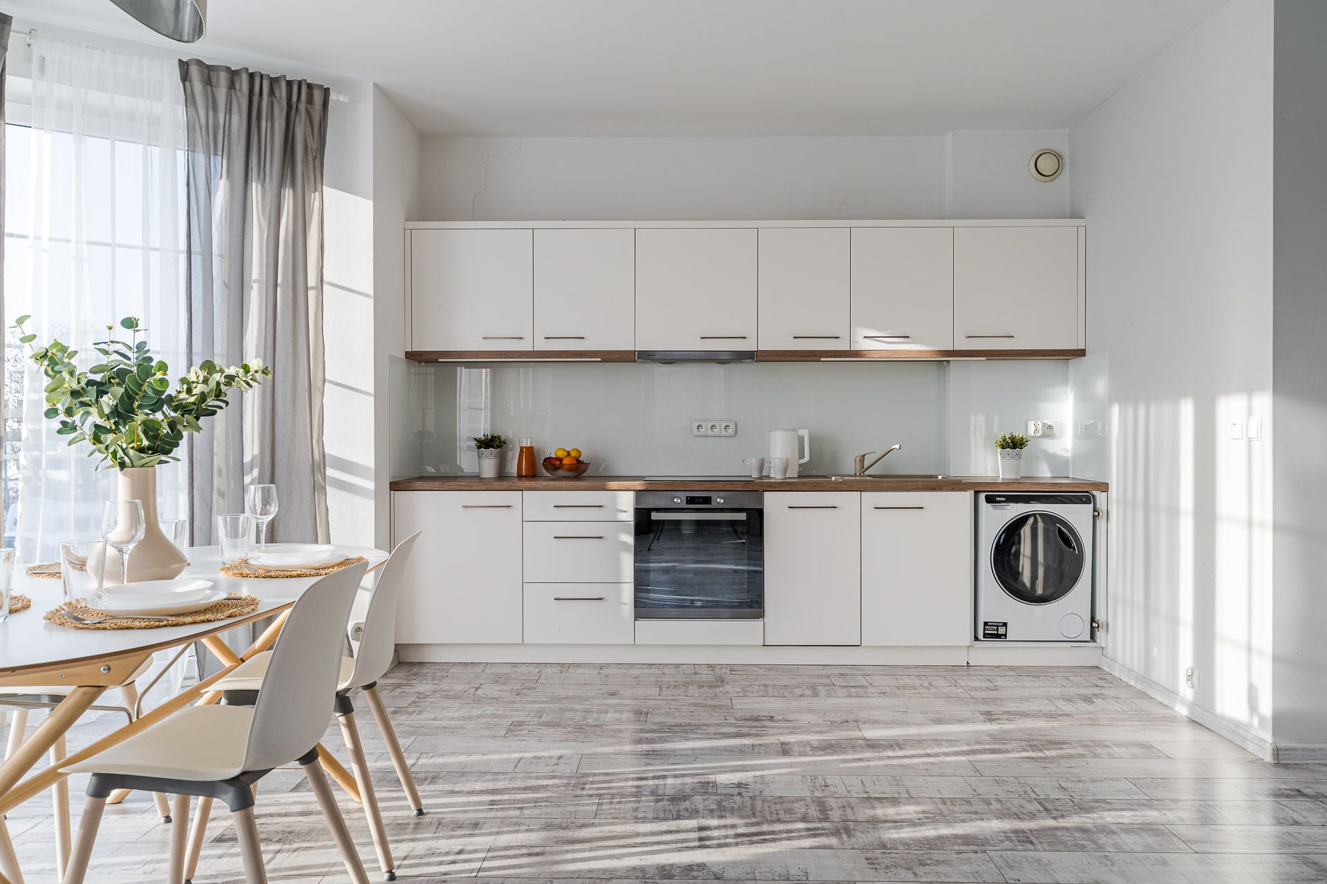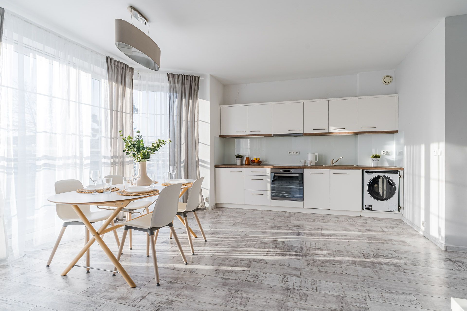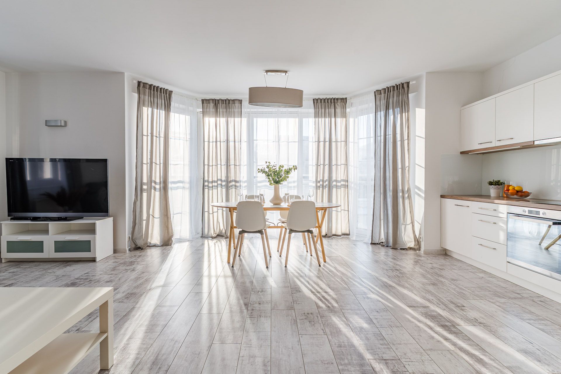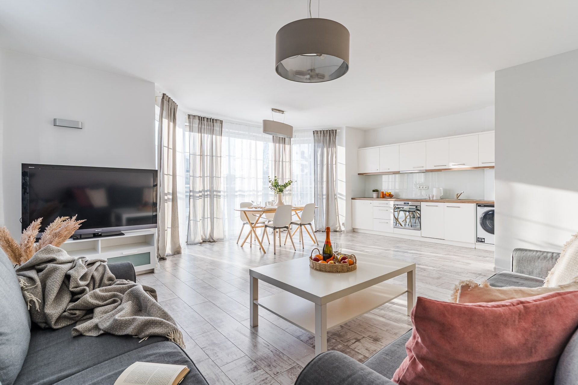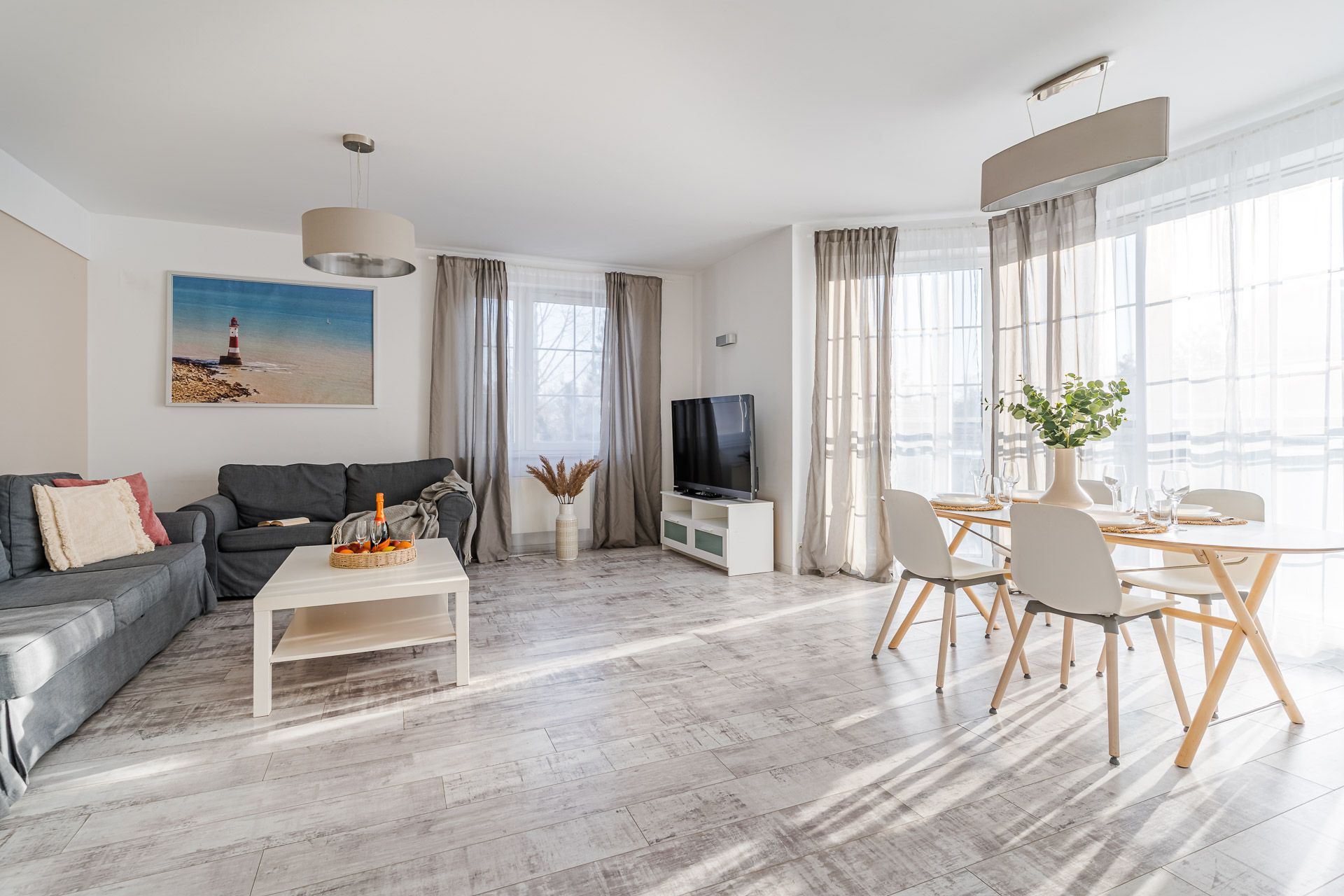 In a large and well sunny living room we have a fully equipped kitchenette. Some television-rest room area allows for moments of relaxation after a busy day. Comfortable sofa can be a bed for two people.