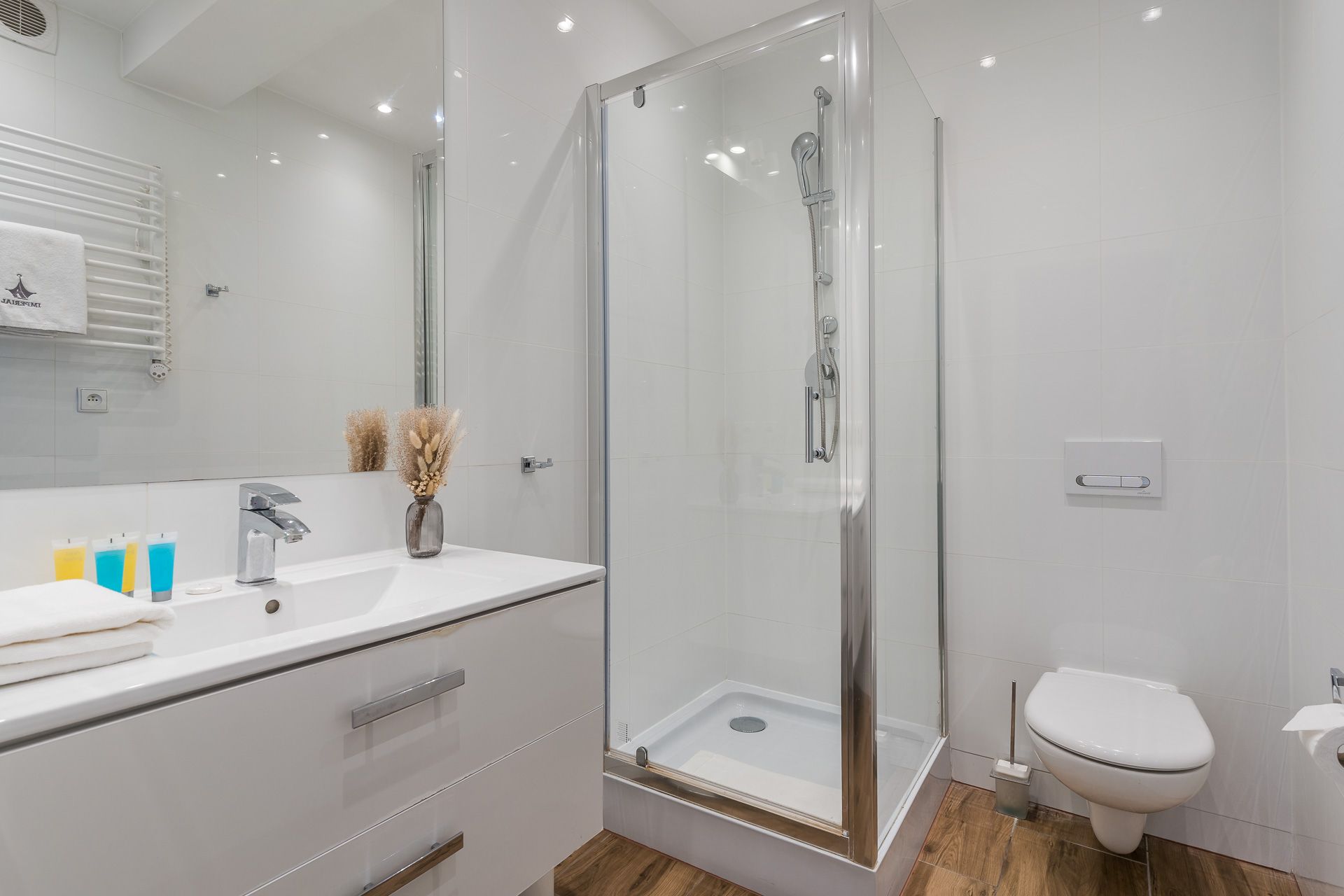 The bathroom suite is equipped with a shower and a washing machine.