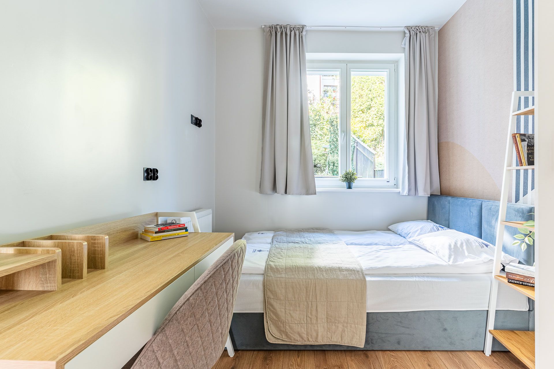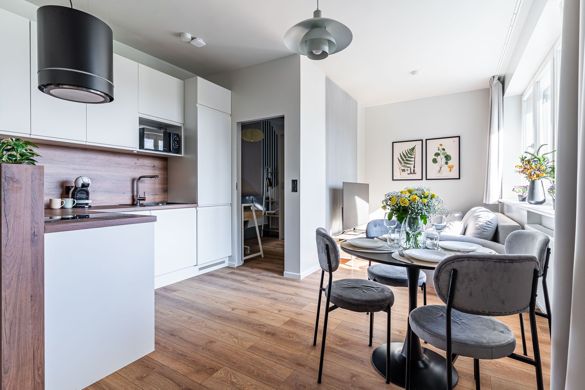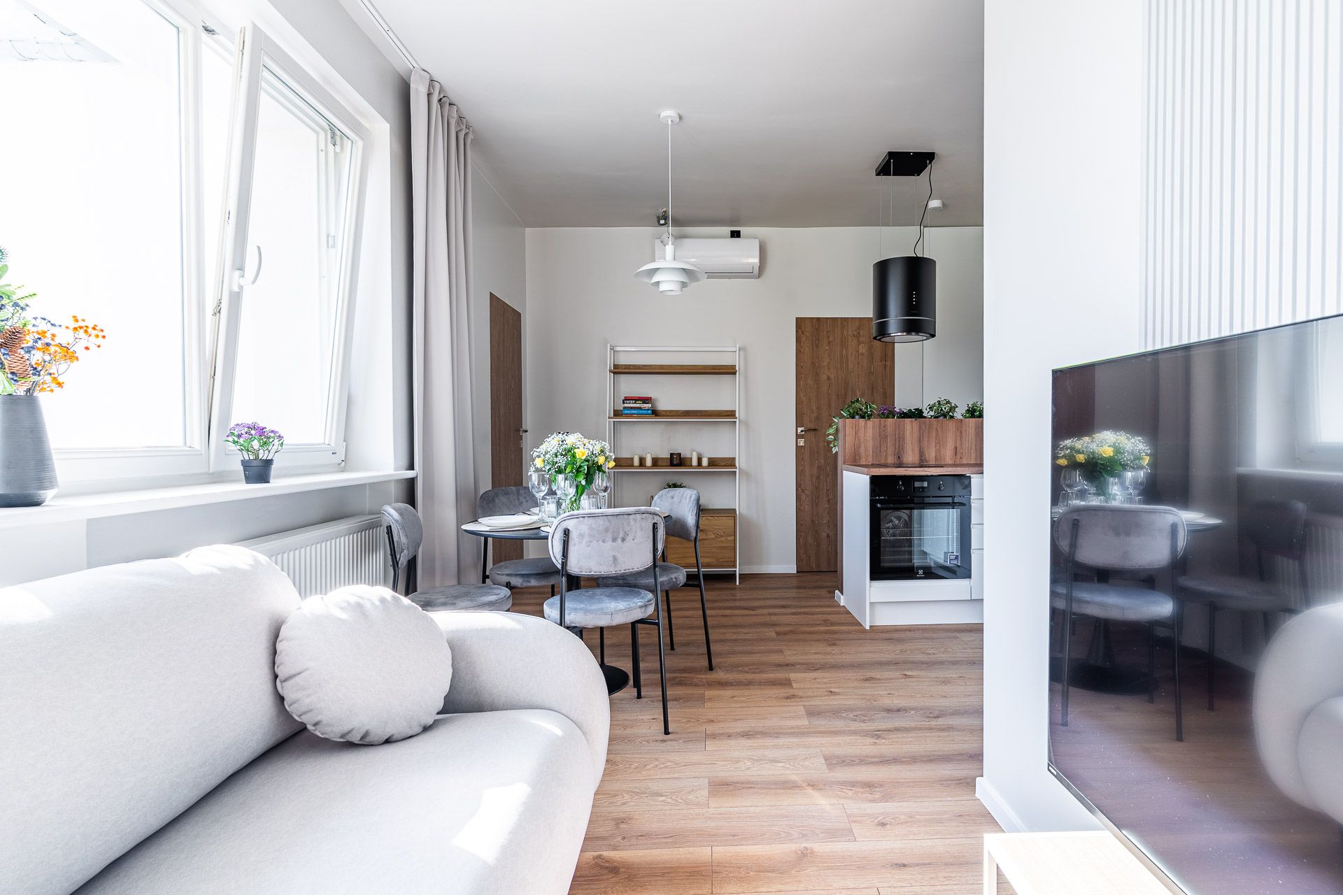 jasne, nowoczesne wnętrze z elementami drewna i naturalnych tkanin