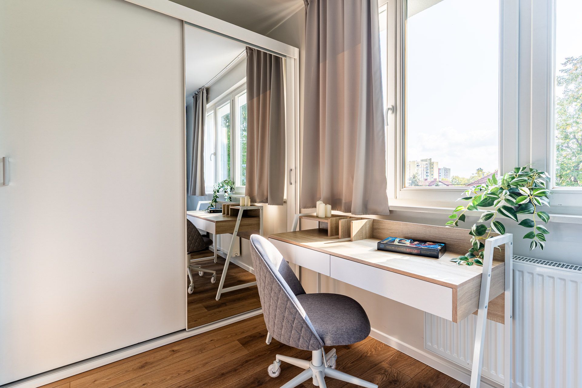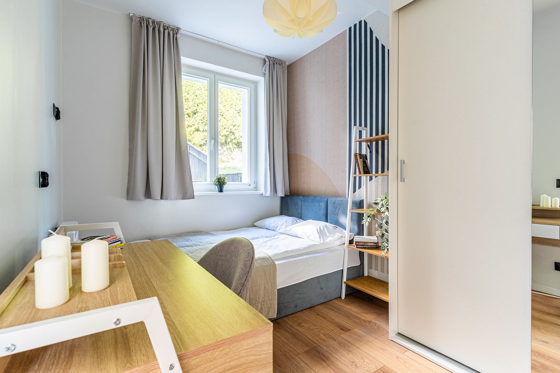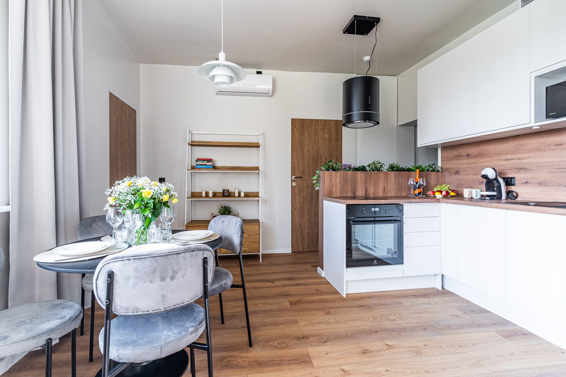 jasne, nowoczesne wnętrze z elementami drewna i naturalnych tkanin